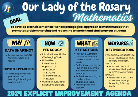 At Our Lady of the Rosary, we identify student learning needs and areas needing improvement across the school through the use of school & student data. An Explicit Improvement Agenda (EIA) is then developed with short, medium and long-term goals as well as building a shared understanding of what improvement strategies look like in classrooms. Our explicit improvement agenda ensures clarity, alignment and collective effort toward enhancing education quality and student outcomes at OLR.